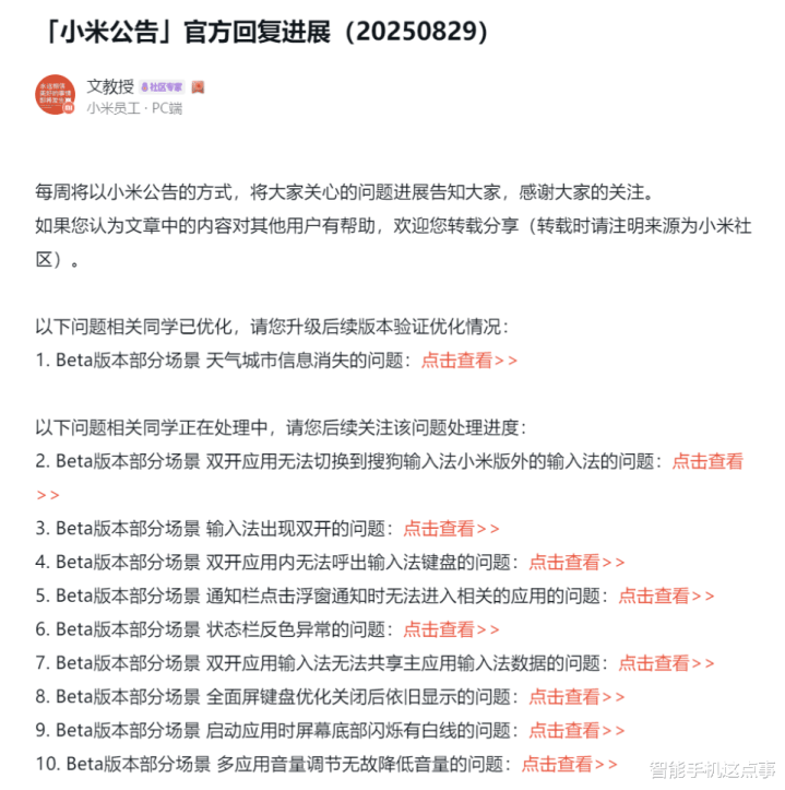 同时Beta版本部分场景通知栏点击浮窗通知时无法进入相关的应用的问题;Beta版本部分场景状态栏反色异常的问题。 Beta版本部分场景双开应用输入法无法共享主应用输入法数据的问题;Beta版本部分场景全面屏键盘优化关闭后依旧显示的问题。 又或者是Beta版本部分场景启动应用时屏幕底部闪烁有白线的问题;Beta版本部分场景多应用音量调节无故降低音量的问题。 目前这些问题都还在排查的过程中,对于遇到这些问题的米粉,大家还是需要耐心等待,一旦修复完成,体验会变得很好。